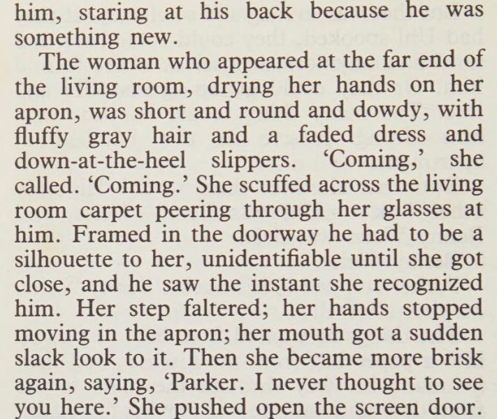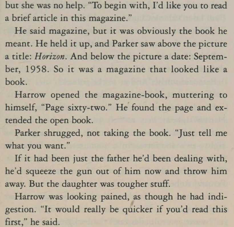 Similarly, Zen’s insistence that Parker reads her newspaper article about the Lady of Arintero calls back to The Mourner, when Bett Harrow’s father Ralph asks Parker to read a magazine article about the Mourners of Dijon, which he refuses.