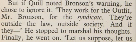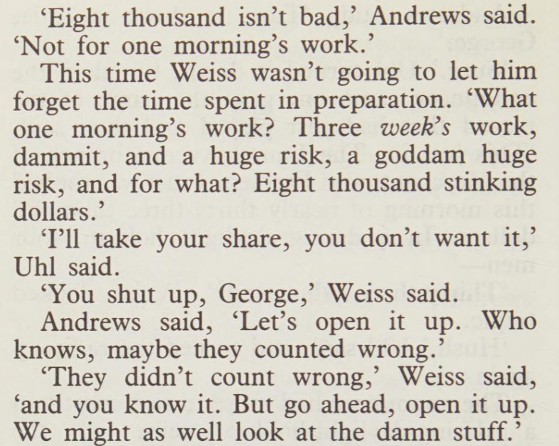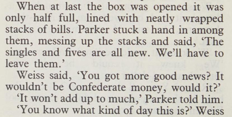 The company serving as a front for the Outfit has a sign reading “Westlake Group” behind the secretary’s desk, similar to the sign referencing Richard Stark and Tucker Coe in the 1990 film The Grifters, adapted for the screen by Westlake.