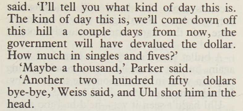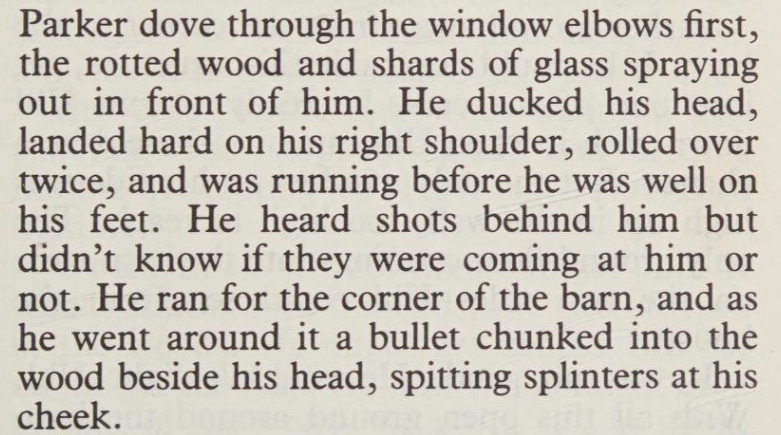 Although Zen plays a role similar to George Uhl in The Sour Lemon Score in this scene, when she shoots Parker and leaves him for dead, it appears to be an intentional mirror of Parker’s wife Lynn committing a similar betrayal and act of violence in The Hunter.