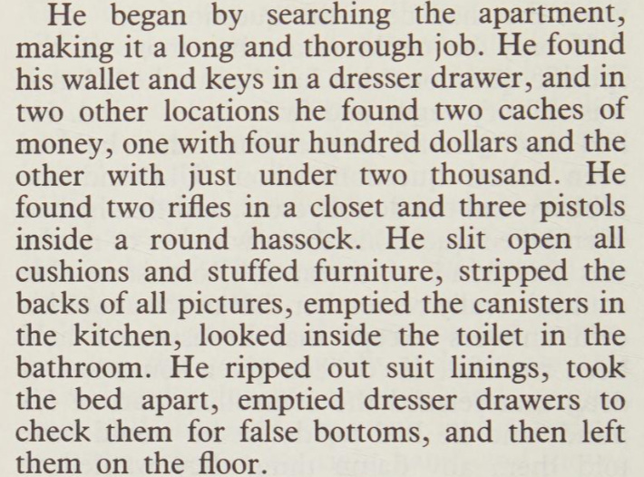 That very same novel also serves as the basis of the scene showing Parker's search for the heist plans in the apartment Bosco shares with his boyfriend.