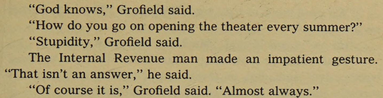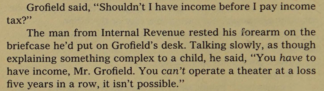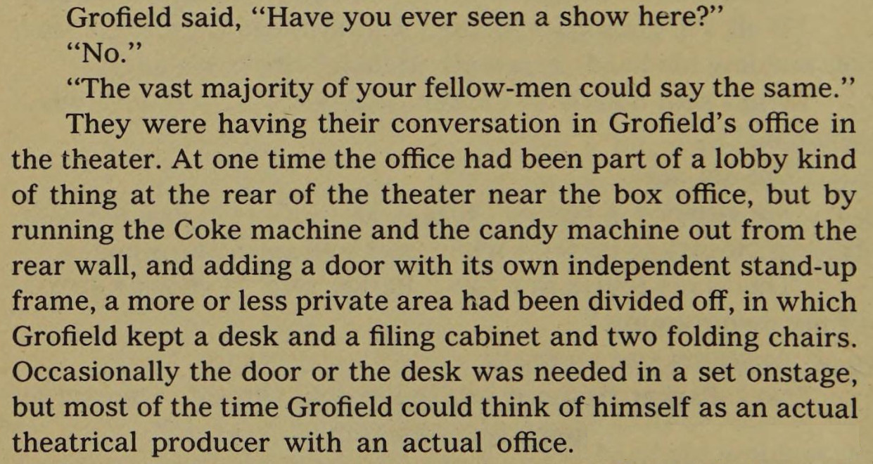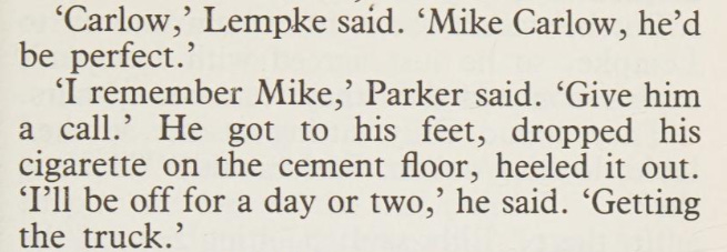 Just like in the novels, Grofield’s barn theater stands in the small town of Mead Grove, Indiana, and his introductory conversation with an IRS employee is taken word-for-word from Butcher’s Moon, even being cut short by Parker calling him on the phone.