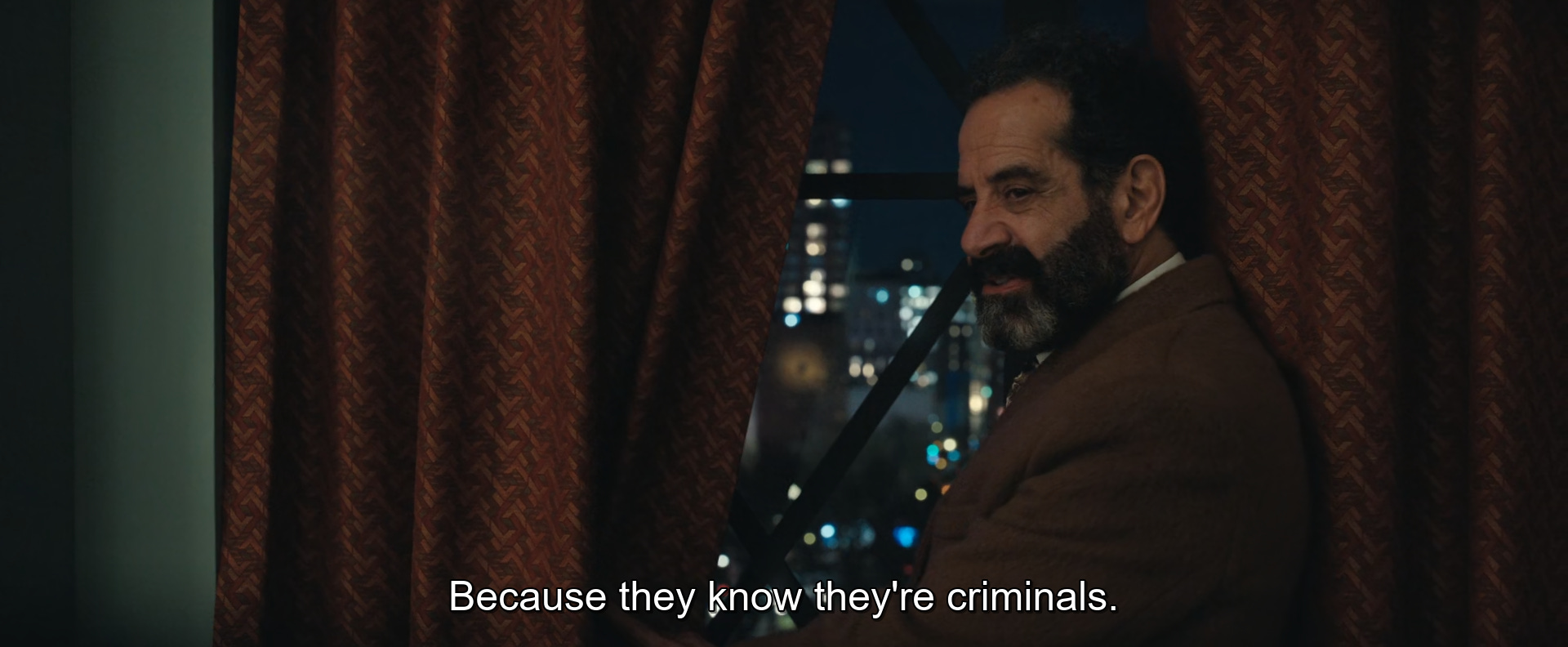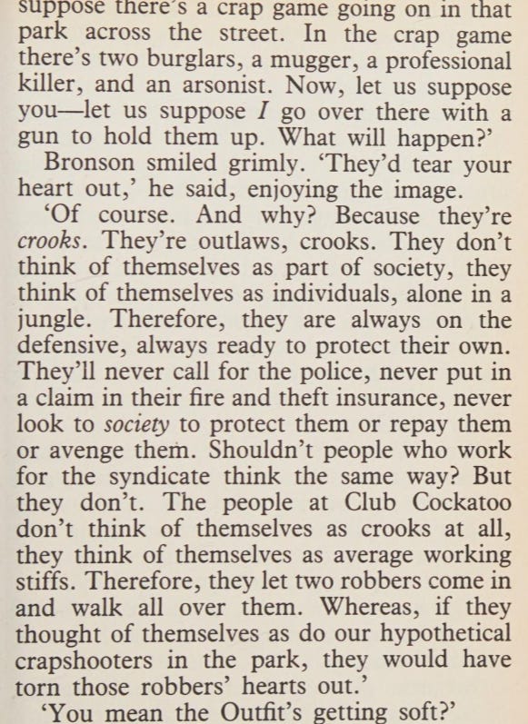 Lozini's speech, echoing a sentiment first expressed in The Outfit, appears to be the last major scene adapting a moment from the books. However, novel references remain scattered throughout.